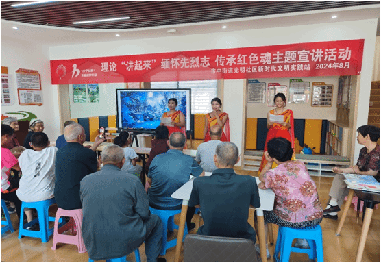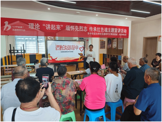 本次活动分“倾听往昔之声、颂唱时代之音、缅怀先人之志”三个板块。在“倾听往昔之声”板块 ,“曙光志愿”宣讲团开展了“西柏坡精神”的主题宣讲。同学们以生动的语言和丰富的历史资料,向社区居民详细阐述了西柏坡精神的形成背景、历史意义及其对当代青年的启示,并围绕西柏坡精神的核心--“敢于斗争、敢于胜利的革命气概,自力更生、艰苦奋斗的创业精神,以及谦虚谨慎、戒骄戒躁的优良作”进行了深入浅出的讲解。在“颂唱时代之音”板块,同学们为社区居民进行了《月光下的中国》朗诵及红色歌曲、舞蹈表演。通过丰富多彩的艺术形式与真挚饱满的情感表达,让社区居民深切感受到中国从苦难中崛起、在挑战中奋进的伟大力量。此外,宣讲团师生与现场居民展开了“红歌接唱”互动,不仅唤醒了老一辈社区居民深藏心底的红色记忆,同时也点燃了现场青少年心中的爱国热情。在“缅怀先人之志”板块,“曙光志愿”宣讲团师生为社区居民精心策划了“看图识人”的经典互动游戏和“爱国之花”手工制作活动。每一幅图像都是对革命先辈英勇事迹的生动再现,让居民仿佛穿越时空,与那些英勇无畏的革命英雄面对面。师生、居民共同编织出一朵朵象征着爱国情怀与传承之美的花朵,每一片花瓣、每一抹色彩都寄托着对革命先辈的深切缅怀与崇高敬意。