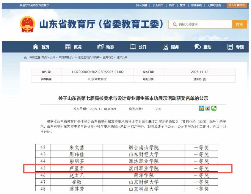 本网bw必威西汉姆联讯 近日,山东省教育厅(省委教育工委)公布了“山东省第七届美术与设计专业基本功”展示活动获奖名单,我院教师卢星君凭借出色的表现荣获教师组一等奖,成为一等奖中为数不多的高职院校选手。